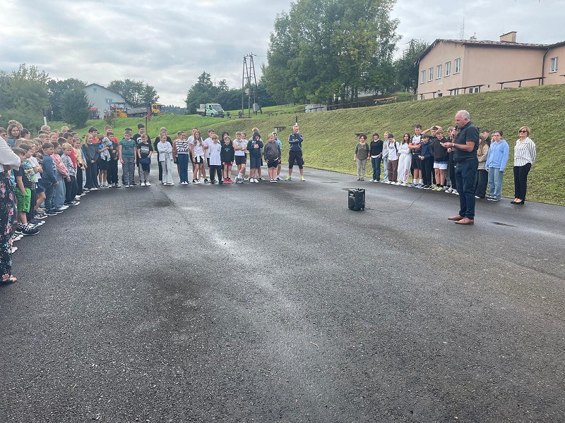 Dbając o bezpieczeństwo naszych uczniów, nauczycieli oraz pracowników administracji i obsługi 19.09.2025 r. o godzinie 11:10 w naszej szkole została przeprowadzona próbna ewakuacja. Po usłyszeniu trzech dzwonków wszyscy sprawnie opuścili klasy, kierując się zgodnie z wcześniej ustalonymi drogami ewakuacyjnym. Po kilku minutach uczniowie, przedszkolaki i pracownicy szkoły dotarli na boisko szkolne. Nauczyciele przekazali panu dyrektorowi informację o stanie obecności w poszczególnych grupach i klasach.