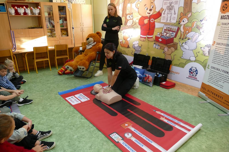 Panie w formie wykładu, jak i praktycznych ćwiczeń z użyciem symulatorów i fantomów zapoznały uczniów z wiedzą i umiejętnościami przeprowadzenia resuscytacji krążeniowo-oddechowej (RKO), obsługą automatycznego defibrylatora zewnętrznego (AED), sposobem ułożeniem ciała poszkodowanego w pozycji bocznej ustalonej oraz postepowaniem w sytuacji zadławienia, złamań, oparzeń i opatrywania ran.  Uczniowie klas V-VIII mieli możliwość pokonywania trasy z  przeszkodami w okularach, które wizualnie i fizycznie imitują widzenie osoby pod wpływem alkoholu, powodując zniekształcenie obrazu, dezorientację, problemy z oceną odległości i koordynacją mięśniową.