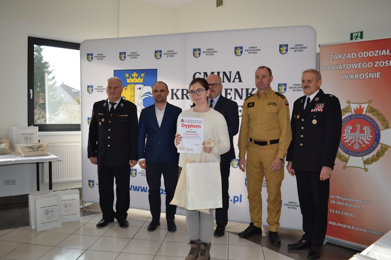 Uczennica klasy VII Julia Ryba otrzymała II nagrodę. Jej praca będzie reprezentowała nasz powiat w eliminacjach wojewódzkich. W tym roku na eliminacje powiatowe Ogólnopolskiego Strażackiego Konkursu Plastycznego wpłynęło rekordowe 132 prace z 33 placówek - przedszkoli, szkół podstawowych i szkół ponadpodstawowych oraz klubów seniora oraz od osób indywidualnych z terenu powiatu krośnieńskiego. Etap powiatowy konkursu zorganizował Zarząd Oddziału Powiatowego ZOSP RP przy współpracy ze Starostwem Powiatowym w Krośnie. Gospodarzami finału była Gmina Krościenko Wyżne, Wójt Gminy Mateusz Liput oraz OSP Krościenko Wyżne.