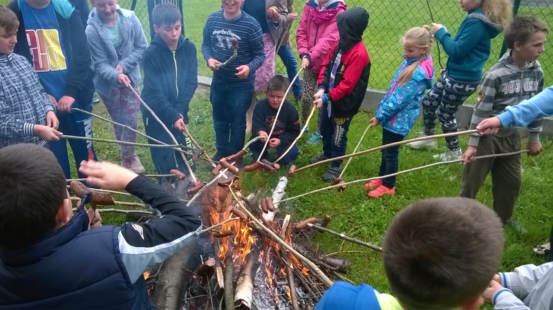 2-go czerwca 2014 (tuż po 1-szym czerwca, który wypadł w tym roku w niedzielę), każde dziecko-duże i małe-miało okazję świętować Międzynarodowy Dzień Dziecka. Nasze świętowanie miało dokładnie miejsce niedaleko szkoły, gdzie zapaliliśmy ognisko i mieliśmy możliwość upieczenia kiełbasek w tradycyjny sposób na przygotowanych wcześniej kijkach. Pogoda nie do końca była dla nas łaskawa i obawialiśmy się deszczu, jednak pomimo złowrogich chmur humorki nam dopisywały i mogliśmy się cieszyć ze wspólnie spędzonego czasu. Poczęstunek był wyborny, co widać po minach niektórych z nas (patrz galeria foto). Jak zwykle nie obyło się bez ,,kiełbasianych" strat, ponieważ kilka kiełbasek się zbuntowało, spadło z patyka i wylądowało prosto w ogniu. Najważniejsze, że innych strat nie odnotowano ;). Wszystkie zakupy związane z organizacją ogniska zostały w całości sfinansowane z funduszy uzyskanych ze sprzedaży ciast podczas ,,Słodkich Śród".