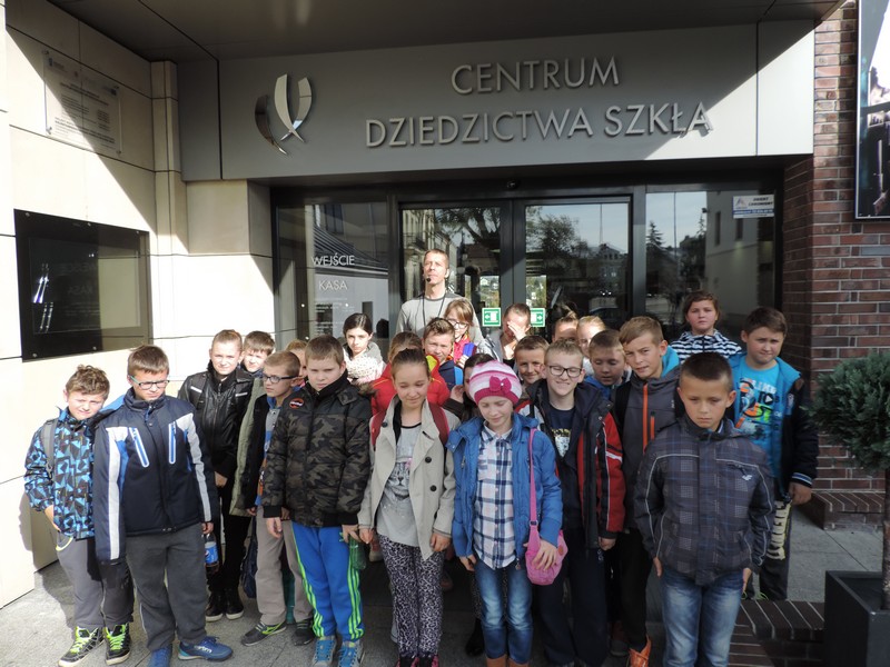 26 października 2015 roku, czterdziestu pięciu uczniów z klas IV – VI wraz z opiekunami udało się na wycieczkę do Krosna. Zapewne każdy z nas był w tym mieście i to wiele razy, ale jak mówi przysłowie: ,,cudze chwalicie - swego nie znacie" postanowiliśmy zwiedzić jedno z najnowszych i najnowocześniejszych muzeów - Centrum Dziedzictwa Szkła. Przez ponad 2 godziny, dzięki wiedzy i uprzejmości przewodników, poznaliśmy ponad 90-cio letnią historię huty szkła. Najważniejszymi atrakcjami Centrum są interaktywne pokazy produkcji i zdobienia szkła, w których mogliśmy brać czynny udział. W piwnicach przedprożnych oraz w sali wystaw czasowych zapoznaliśmy się natomiast z ekspozycjami prezentującymi zarówno szkło artystyczne, wykonane przez najlepszych polskich twórców, oraz użytkowe – wspaniałe przykłady najwyższego kunsztu wzornictwa użytkowego. Z bliska przyjrzeliśmy się pracy hutników, szlifierzy, grawerników, pań malujących na szkle czy wykonujących witraże. Podziwialiśmy też potężny obraz wykonany w technice 3D, który to znajduje się na podłodze - wrażenia niesamowite! W sali multimedialnej obejrzeliśmy film prezentujący okres od 1923 roku, czyli od powstania huty, aż do dnia obecnego. W sklepie z ręcznie wykonanymi szklanymi cudeńkami zakupiliśmy pamiątki. Następnie udaliśmy się na Rynek by zrobić kilka pamiątkowych fotek a także na mały posiłek do pobliskiej pizzerii.