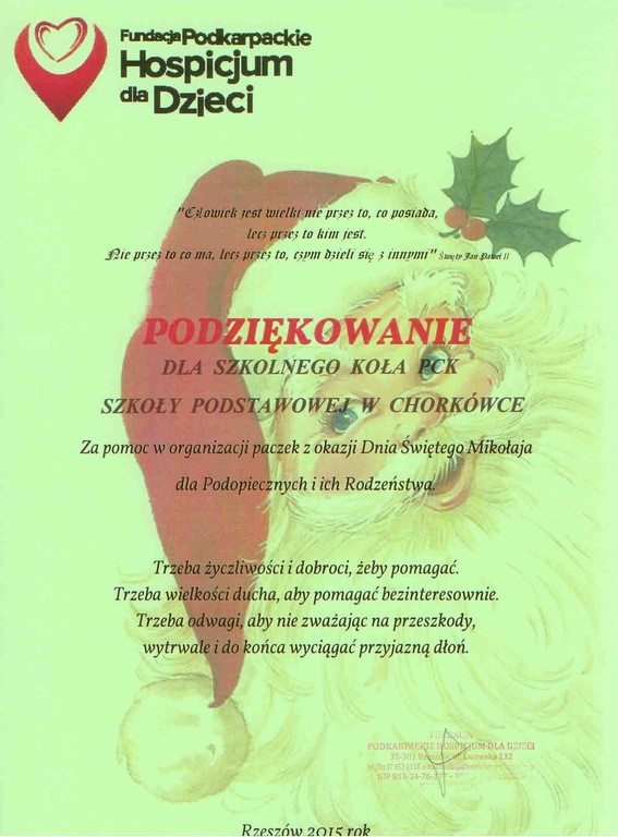 Wszystkie zebrane rzeczy wraz z kartkami zostały przekazane Fundacji Podkarpackiego Hospicjum dla Dzieci w Rzeszowie dnia 22. 12. 2015 r.