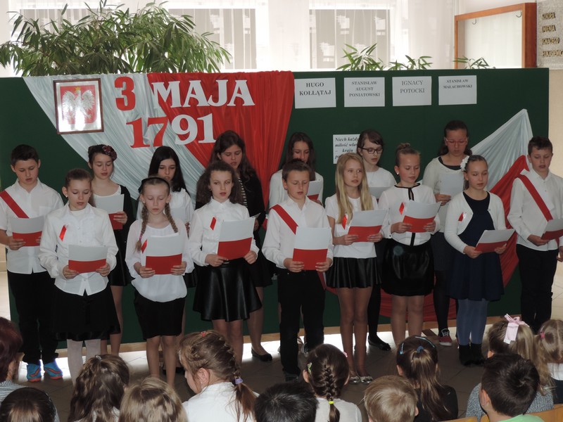 Na tle dekoracji akcentującej nasze symbole narodowe uczniowie zapoznali zebranych z okolicznościami uchwalenia Konstytucji, przybliżając atmosferę, jaka wówczas panowała. Patriotyczne pieśni i wiersze skłaniały do refleksji i zadumy nad historią naszego kraju. Była to bardzo interesująca lekcja historii nacechowana patriotyzmem. Po apelu pani dyrektor wręczyła dyplomy zwycięzcom Szkolnego Konkursu Wiedzy o Polsce.