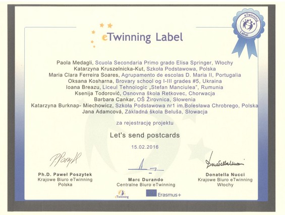 15 lutego na platformie etwinning zarejestrowano projekt pt.,,Let's send postcards".Celem projektu było przede wszystkim zapoznanie się z uczniami z różnych krajów, ich miejscem zamieszkania i krajem pochodzenia, poznanie ciekawych miejsc czy zabytków za pomocą informacji zawartych na kartce pocztowej, dostrzeżenie korzyści płynących z nauki języków obcych, napisanie kartki pocztowej w języku angielskim. Do realizacji projektu zostali zaproszeni uczniowie wraz z opiekunami z europejskich państw. Komunikacja odbywała się za pomocą etwinning, czyli platformy dla nauczycieli z Europy, która pozwala na nawiązywanie kontaktów pomiędzy szkołami, współpracę przy projektach i dzielenie się pomysłami. Głównym założeniem projektu była międzynarodowa współpraca i działanie chętnych nauczycieli i uczniów ukierunkowane na realizację celów zawartych w projekcie. Do współpracy przystąpili przedstawiciele: Polski, Ukrainy, Słowacji, Rumunii, Włoch, Portugalii, Chorwacji i Słowenii.