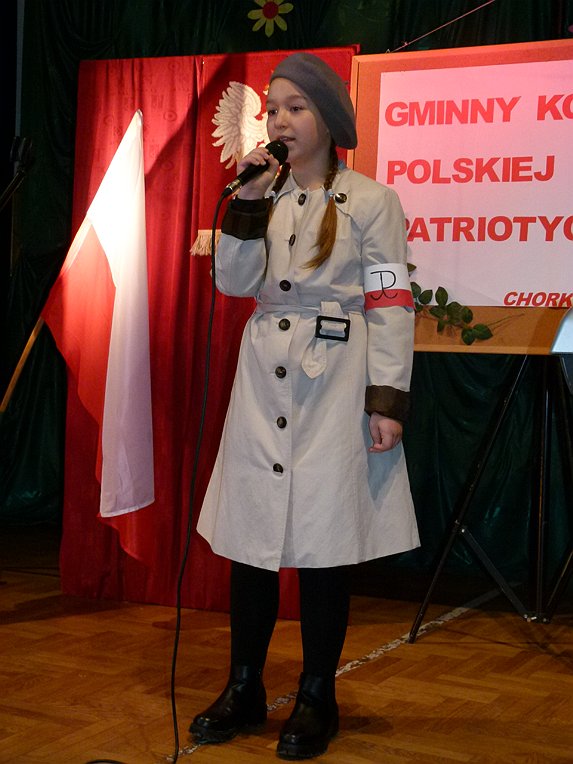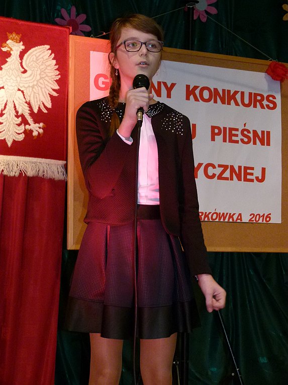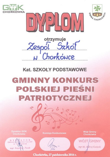 27 października 2016 roku, odbył się Gminny Konkurs Polskiej Pieśni Patriotycznej organizowany przez Gminny Ośrodek Kultury w Chorkówce. W konkursie udział wzięli uczniowie klas IV-VI ze szkół podstawowych. Naszą szkołę reprezentowały: Alicja Kozielec, która zajęła II miejsce, Amelia Kozubal otrzymała wyróżnienie i Karolina Kludacz. Laureaci otrzymali nagrody książkowe i pamiątkowe dyplomy. Uczestnicy, którzy zajęli I, II i III miejsce będą reprezentować naszą gminę na etapie powiatowym 3 listopada 2016r. w Rymanowie.