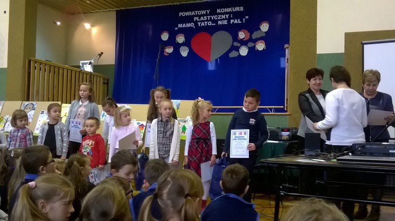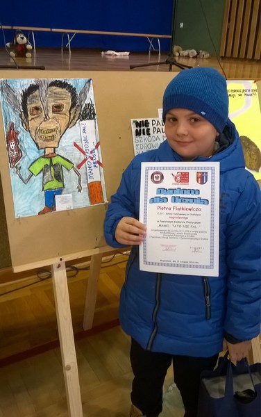 Uczniowie naszej szkoły Piotr Fiałkiewicz z klasy III oraz Kamila Wiatr uczennica klasy VI zostali laureatami ósmej edycji powiatowego konkursu plastycznego „Mamo, tato…nie pal”, który był adresowany do przedszkolaków i uczniów szkół podstawowych z terenu powiatu krośnieńskiego i miasta Krosna. Uroczyste podsumowanie konkursu i wręczenie nagród odbyło się 17 listopada w Szkole Podstawowej w Wojaszówce. Na konkurs, który cieszy się dużą popularnością wpłynęło w tym roku blisko 200 prac z 50 placówek. Jury po dokonaniu oceny wszystkich prac przyznała równorzędne nagrody w trzech kategoriach wiekowych.