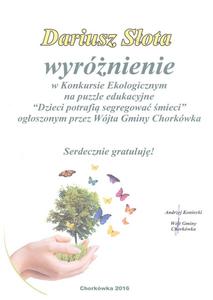 14 grudnia 2016 r. odbyło się wręczenie nagród w Gminnym Konkursie Ekologicznym na puzzle edukacyjne "Dzieci potrafią segregować śmieci". Wyróżnienie zdobył Dariusz Słota - uczeń klasy II.