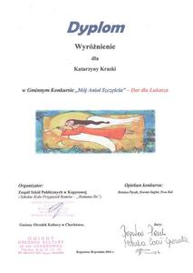 Wzorem lat ubiegłych nasi uczniowie uczestniczą w konkursach plastycznych o tematyce bożonarodzeniowej, organizowanych na terenie gminy i powiatu. Są to konkursy rozwijające wyobraźnię i umiejętności manualne dzieci: „Szopka Bożonarodzeniowa”, „Moje Boże Narodzenie” oraz „Mój Anioł Szczęścia” –Dar dla Łukasza.