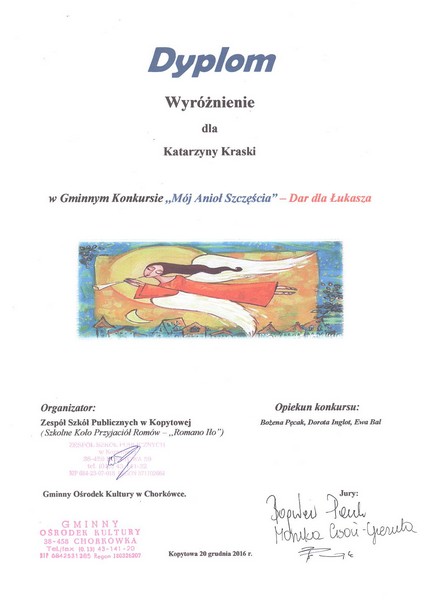 Wykonane anioły przez uczniów klas IV-VI zostały dostarczone na konkurs gminny „Mój Anioł Szczęścia”. Serdecznie dziękujemy uczniom którzy wraz z rodzicami zaangażowali się w akcję charytatywną na rzecz druha Łukasza. Uczestnicy konkursu: Kamil Skalski, Emilia Machura, Mateusz Bobusia, Tomasz Pilawski, Miłosz Rachwał, Wiktor Kijek, Kamil Kludacz, Magdalena Bugiel, Dominika Kielar, Kamila Wiatr, Mateusz Harsze, Katarzyna Kraska, Weronika Prętnik, Mariola Najba, Dominika Bogusz.