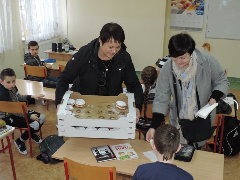 Aby tradycji stało się zadość, Rada Rodziców przygotowała dla wszystkich uczniów upominek - każdy otrzymał słodkiego pączka obficie posypanego cukrem pudrem. Mniam, widać po minach, że każdemu bardzo smakowało!