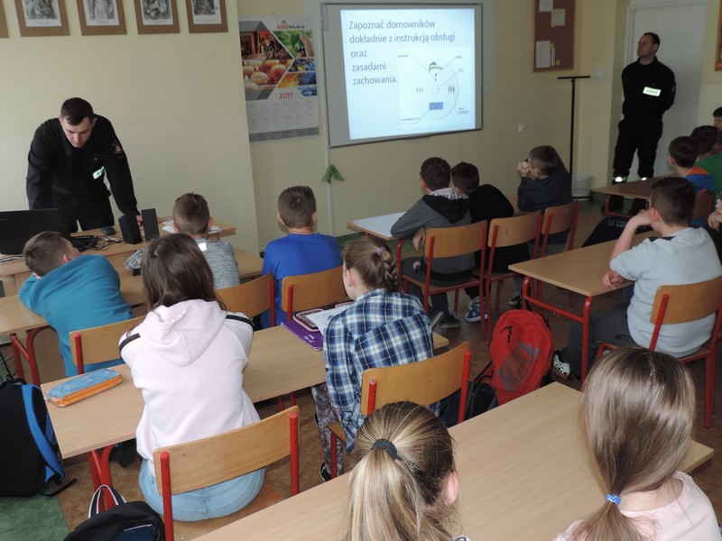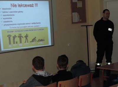 Drugi temat to: "Czad- cichy zabójca”. Uczniowie dowiedzieli się, jak ważne są nawet drobne detale mogące doprowadzić do zagrożenia życia oraz ,jak postępować z osobą, która uległa zaczadzeniu. W spotkaniu wzięli udział wszyscy uczniowie naszej szkoły, najpierw kl. IV- VI, a później kl. 0- III. Wszystkim spodobał się sposób prowadzenia prelekcji. Panowie mówili zwięźle i na temat, a swoje wypowiedzi uzupełniali pokazem multimedialnym. Na koniec zadawali pytania, sprawdzając, co dzieci zapamiętały. Jednak przekonali się, że dzieci uważnie słuchały.
