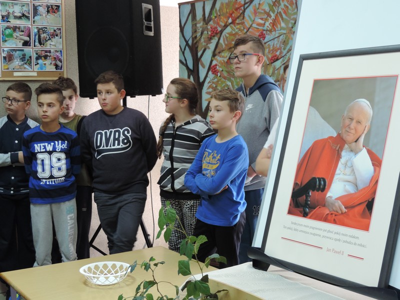 Jak co roku w naszej szkole odbył się dzień poświęcony Największemu z Polaków, Janowi Pawłowi II. Odstąpiliśmy od tradycyjnej formy akademii na rzecz konkursu międzyklasowego. Wielu emocji dostarczyły pytania zadawane przez księdza, które dostosowane zostały do wiedzy i możliwości poszczególnych klas. Nagrodą za udaną odpowiedź były kolorowe piłeczki wrzucane do koszyków każdej klasy. Wszystkim zależało na jak najlepszych odpowiedziach, emocji było sporo, wielu uczniów błysnęło wiedzą. Z prawdziwą przyjemnością należy stwierdzić, że najlepszą klasą została kl. III, a więc ta, która przygotowuje się do Pierwszej Komunii Świętej. Ponieważ wszyscy wiedzą, że prawdziwy konkurs ma zachęcać, a nie zniechęcać, wszystkie klasy zostały nagrodzone słodkościami.